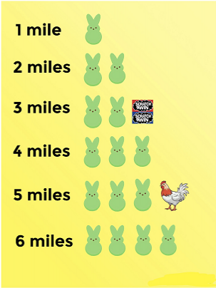 Join us for a road trip going up to 10 miles. The farther you make it the better the prizes! Simply pick out a direction to go each week (North, South, East, West) and as long as you don't pick the 1 wrong direction, you'll stay on the trip. Prizes awarded for however miles you earned before you make that possible wrong turn.