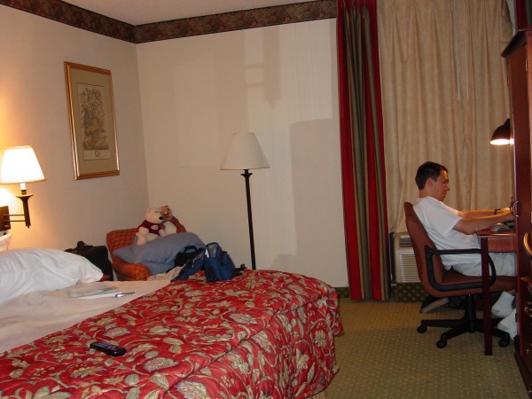 Shawn in the hotel room - our temporary home for a week and a half